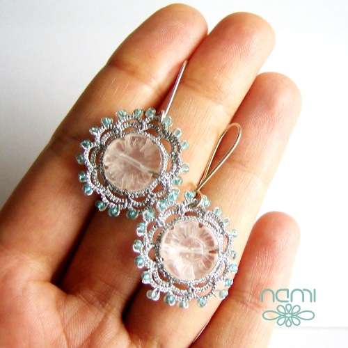 Koronką frywolitkową otoczyłam rzeźbiony w kształt kwiatka kwarc różowy. W płatki wplotłam malutkie kuleczki apatytu.